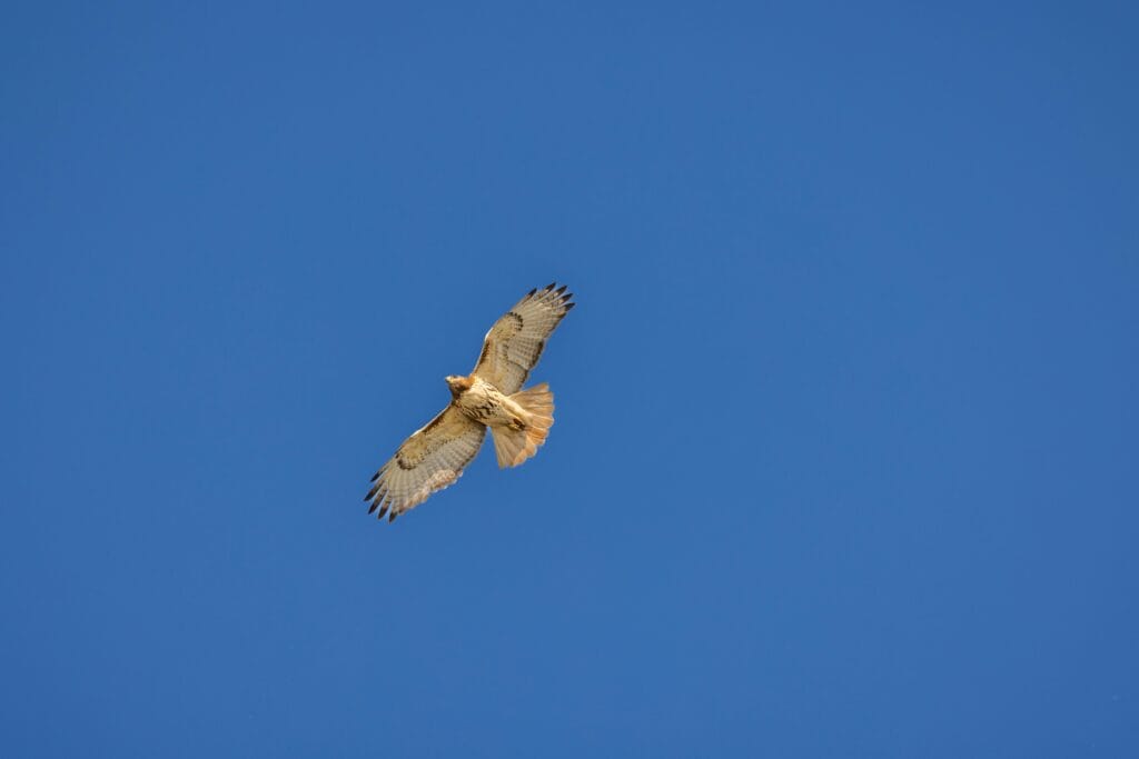 Der majestätische und mächtige Rotschwanzbussard ist ein häufiger Anblick in Texas, den man oft hoch über offenen Feldern und Autobahnen kreisen sieht.