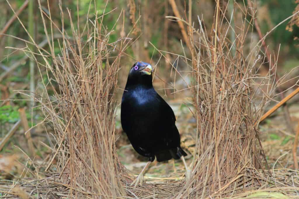 Der Laubenvogel, der in Australien und Neuguinea beheimatet ist, ist für seine architektonischen Fähigkeiten bekannt. Um ein Weibchen anzulocken, baut das Männchen eine „Laube“, eine komplizierte Struktur aus Zweigen und Gräsern.