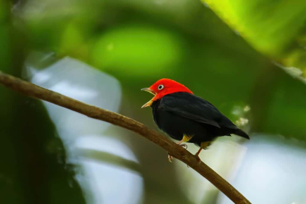 Diese kleinen Vögel haben einen auffälligen roten Kopf und sind für ihr einzigartiges Balzverhalten bekannt.