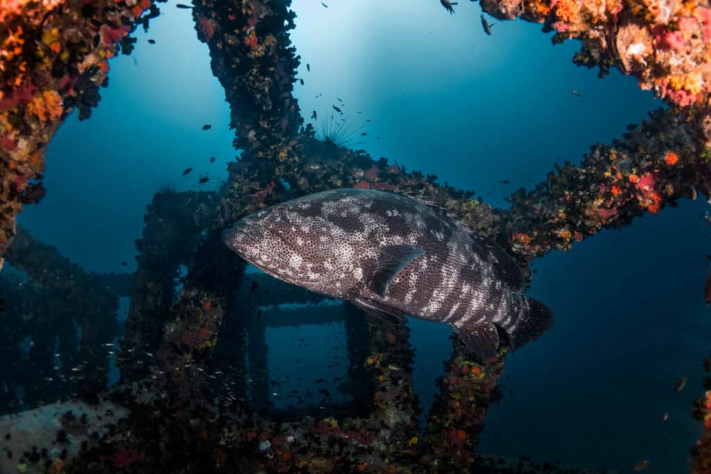 Denken Sie an die beeindruckende Größe des Riesenzackenbarsches, der bis zu 3 Meter lang und bis zu 800 Pfund schwer werden kann.
