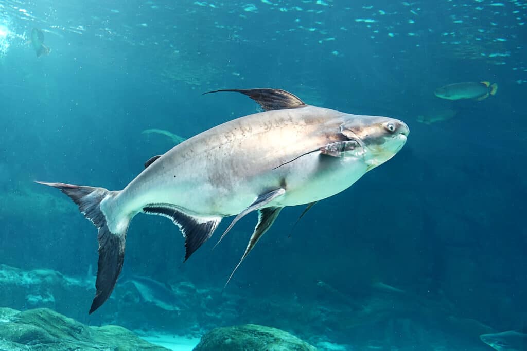 Stellen Sie sich den Mekong-Riesenwels vor, einen Süßwasserriesen mit einem Gewicht von über 600 Pfund und einer Länge von bis zu einem Meter.