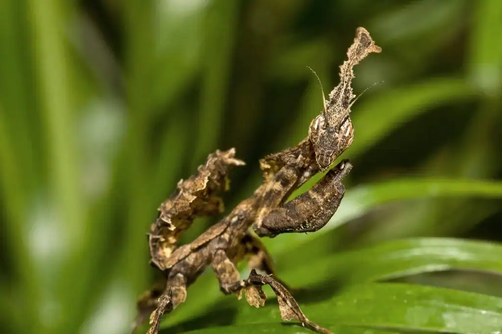 Obwohl sie zerbrechlich aussieht, ist die Gespenstschrecke ein geschickter Räuber, der Insekten mit rascher Präzision erbeutet.