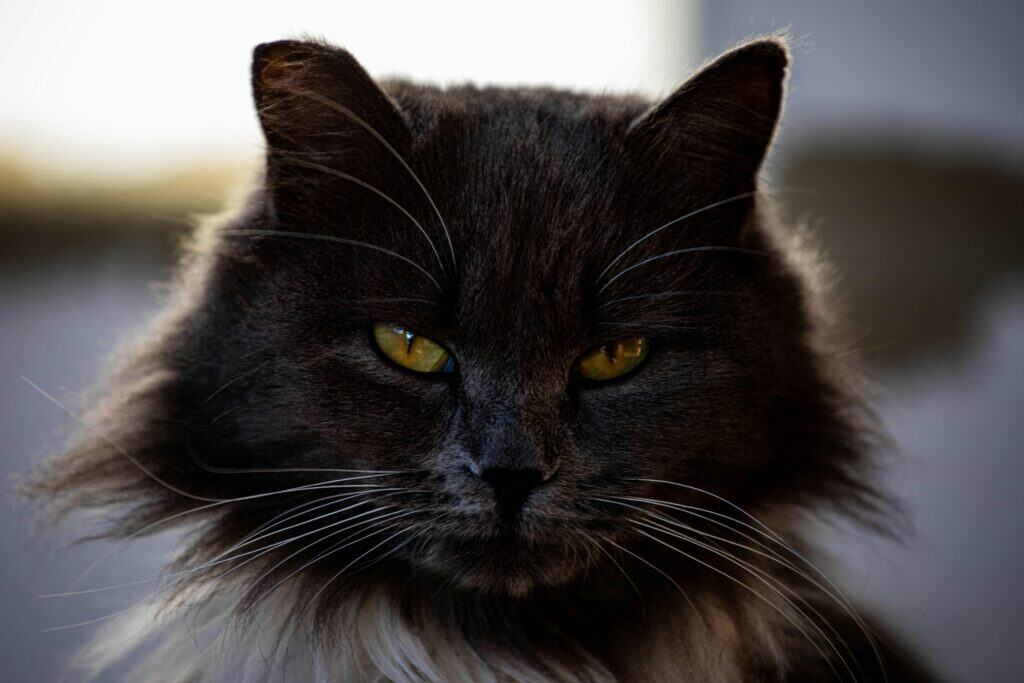 Die Norwegische Waldkatze mit ihrem dichten, luxuriösen Fell und den stechenden Augen sieht aus, als gehöre sie in eine nordische Saga.