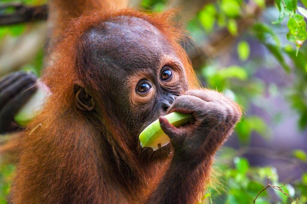 Orang-Utans sind geduldige Sammler und ernähren sich von Früchten, Blättern und Insekten.